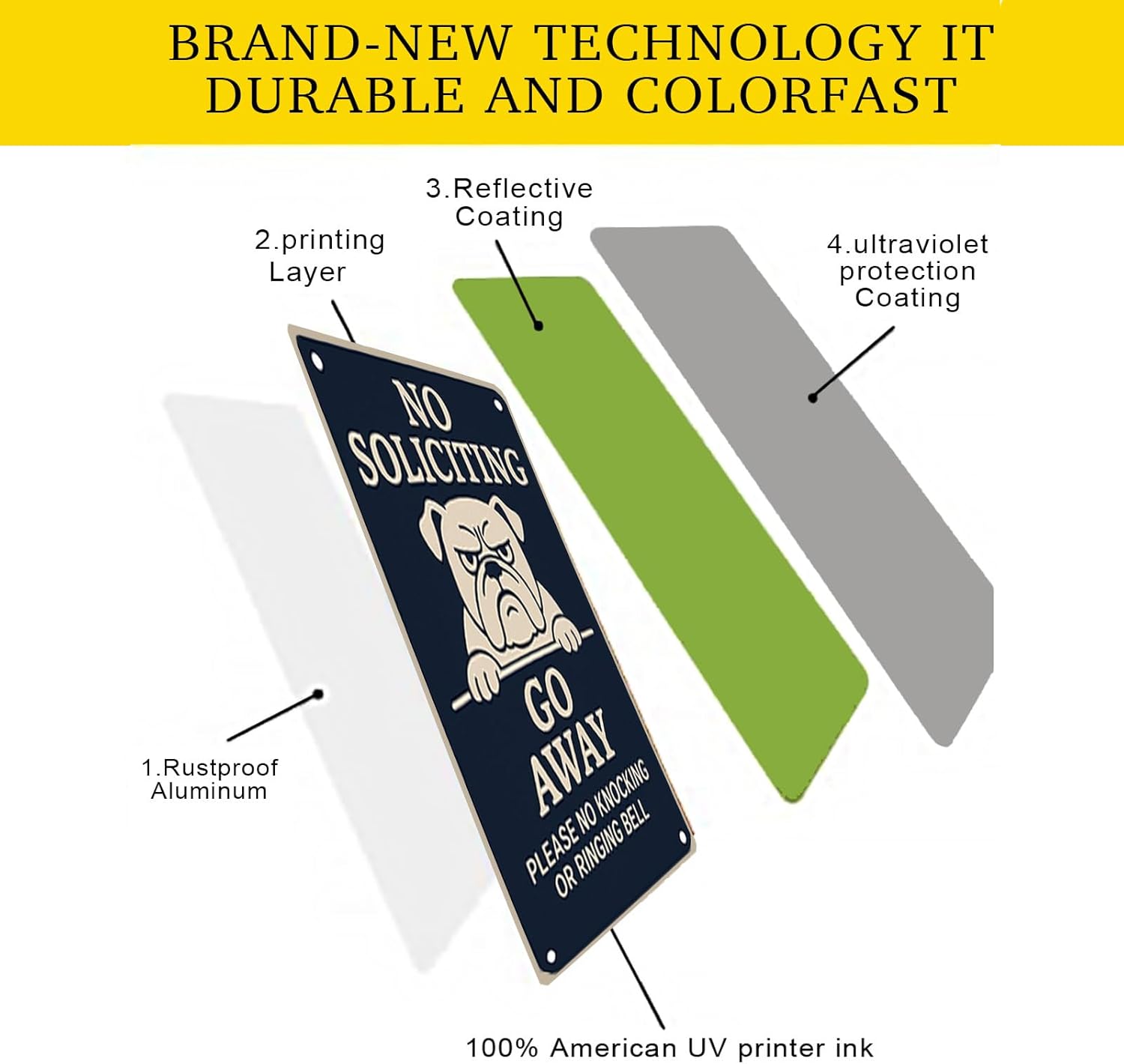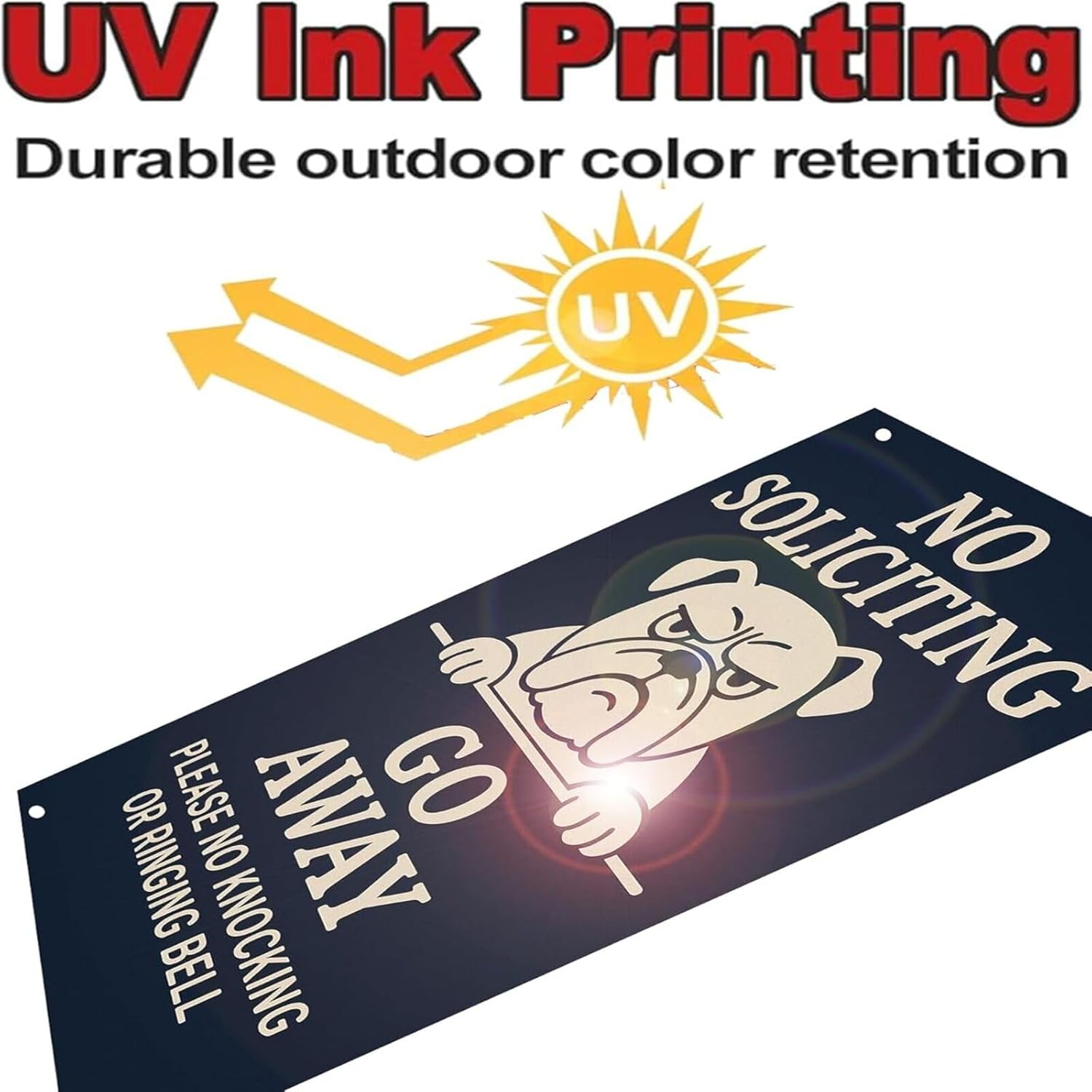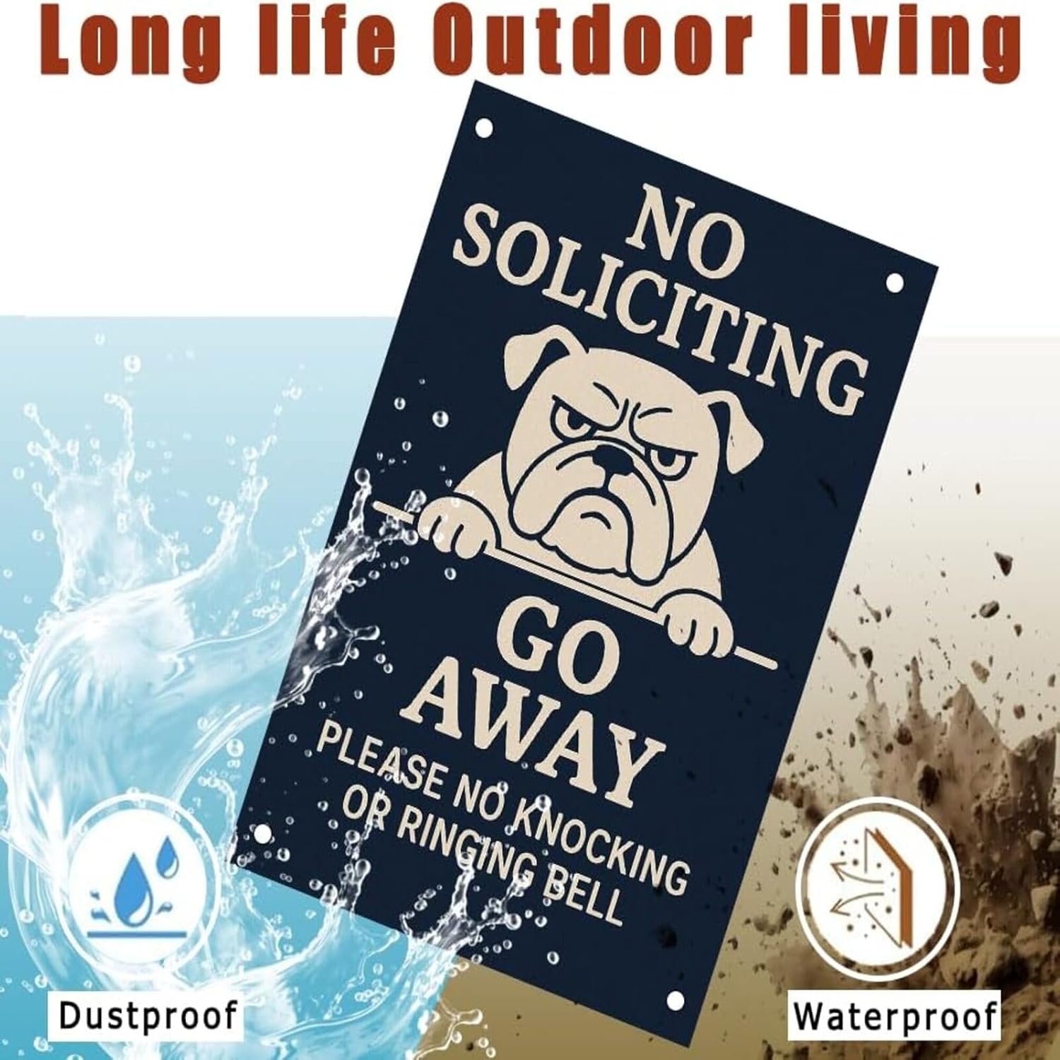 - DOUBLE DETERRENT FOR INTRUDERS & SOLICITORS – Features a bold "No Soliciting – Go Away" message paired with a fierce bulldog graphic delivering a strong visual and verbal warning to deter trespassers strangers and unwanted salespeople. Ideal as a beware of dog sign no soliciting go away bulldog sign and private property protection sign for home yards front doors or business entrances.