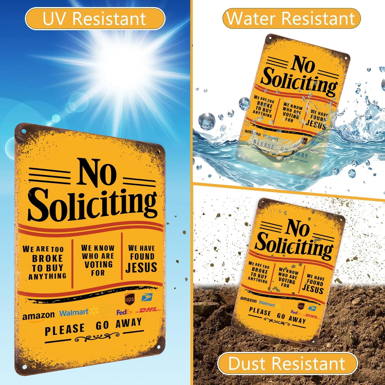 - Durable Aluminum Construction: Crafted from premium rust-proof aluminum, this no soliciting sign for front door is weatherproof, waterproof, and fade-resistant. Unlike a no soliciting sticker for front door or magnetic sign, this heavy-duty version is made for year-round outdoor use, making it ideal as a commercial no solicitation sign for business front door.