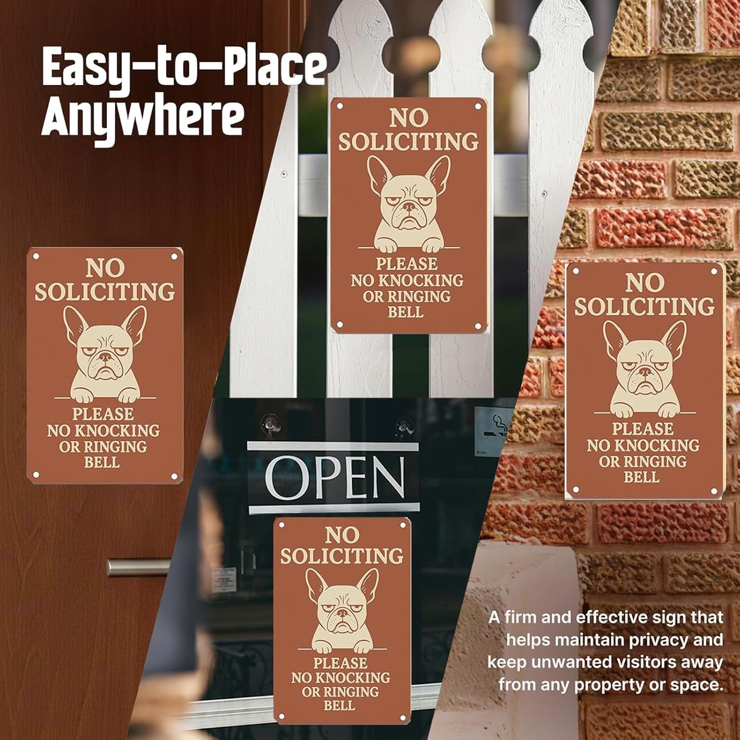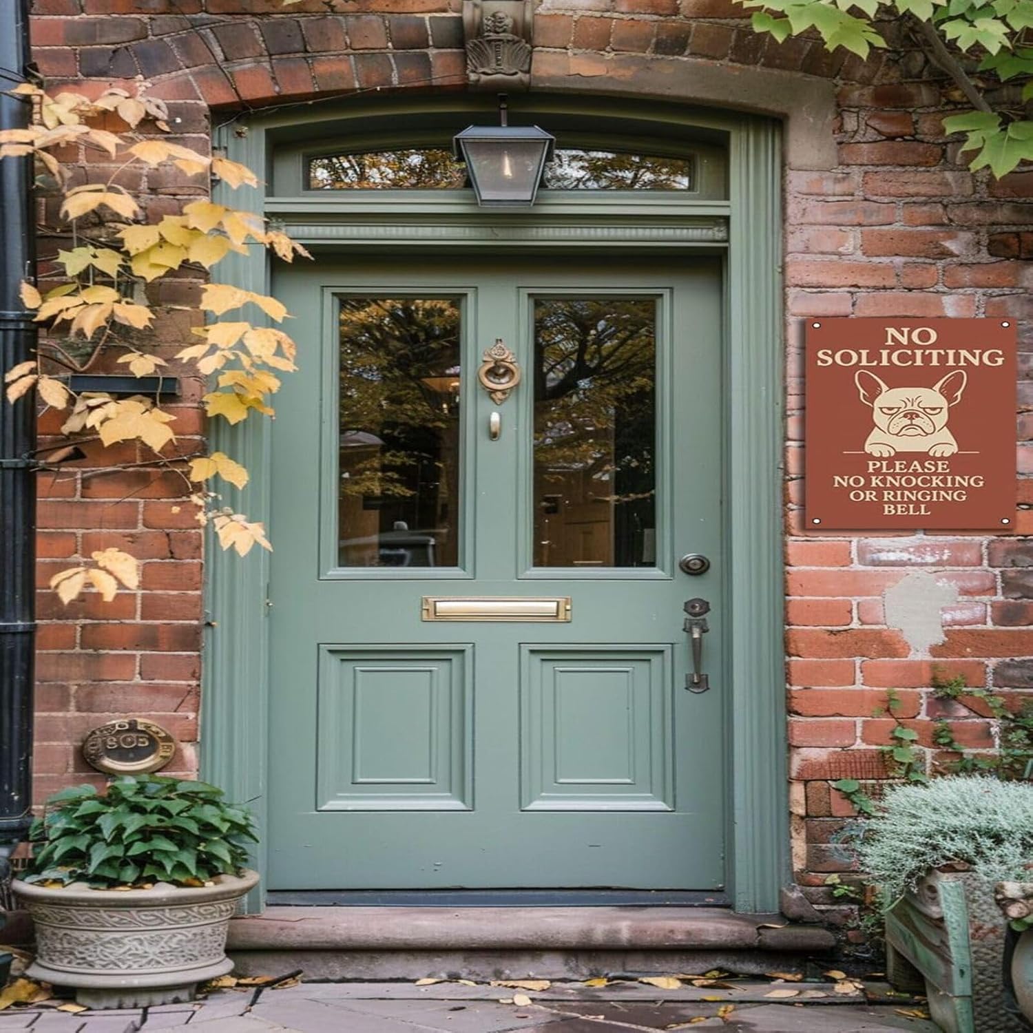 No Soliciting Sign for House - 9x12 Inch French Bulldog Cartoon Design Aluminum UV Printed Waterproof Outdoor Yard Fence Gate Front Door Sign with Free Screws & Rope Pet Style Property Privacy Notice